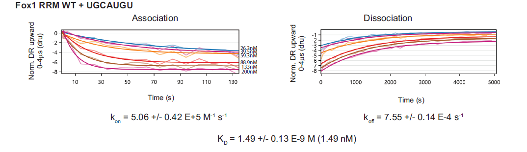 通過該技術,研究人員成功地研究了三種不同的蛋白質與RNA的結合,并得到了與其他常用方法(如SPR或ITC)相近的結果,三種不同親和力的蛋白質與RNA的相互作用:Fox-1 RRM(親和力為1.09 μM)、SRSF1 RRM2(親和力為0.8 μM)和Tra2- β1 RRM(親和力為2.25 μM)。通過switchSENSE技術,可以測量蛋白質與RNA結合和解離的動力學參數。通過測量DNA-RNA雙鏈的切換速度,可以獲得可重復的KD值。這兩種方法在研究不同類型的相互作用時是互補的。switchSENSE®方法,可以測量非常低的KD值,例如Fox-1 RRM的KD值為1.49 nM。此外,與其他使用熒光檢測蛋白質-RNA相互作用的方法相比,switchSENSE®方法不需要對生物分子進行標記,并且需要的材料量更少,成本更低。