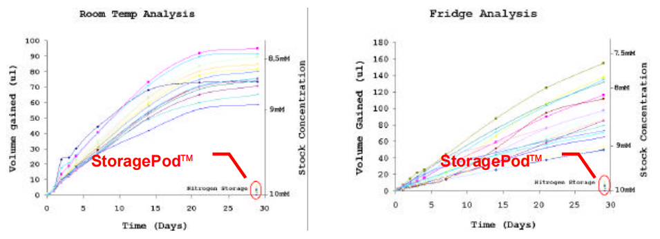 圖1:在室溫、冰箱和氮氣環境下,10mM樣品儲存在2mL帶有透氣性的隔膜的Fisher小瓶中,體積增加量和儲存液濃度隨時間變化圖。每條曲線對應一瓶的化合物。