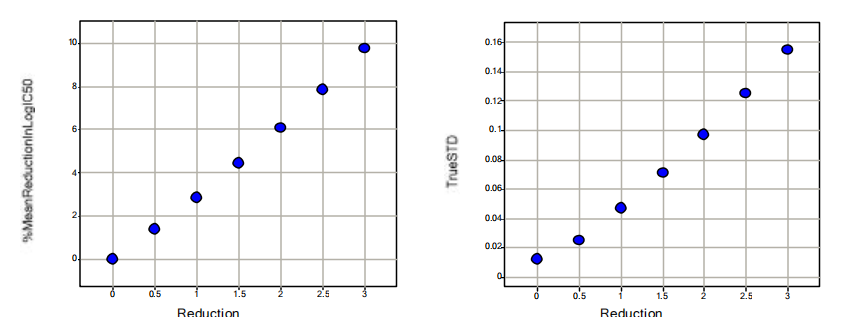 圖2的右圖顯示了LogIC50估計值的平均標準偏差。隨著儲存液濃度的降低,這些平均標準偏差也會迅速增大。這與標準統計分析得出的結果不同,標準統計分析得出的平均標準偏差總是與實驗中正確設置濃度時的平均標準偏差相近。例如,當儲存液濃度從10mM降至8mM時,LogIC50的估計標準偏差為0.0971,而不是常規統計分析中的0.0117(大八倍多)。對變異性的低估可能會導致對數據質量的錯誤認知,并導致不正確的功效分析(例如,需要進行多少次觀察和重復)。