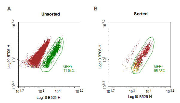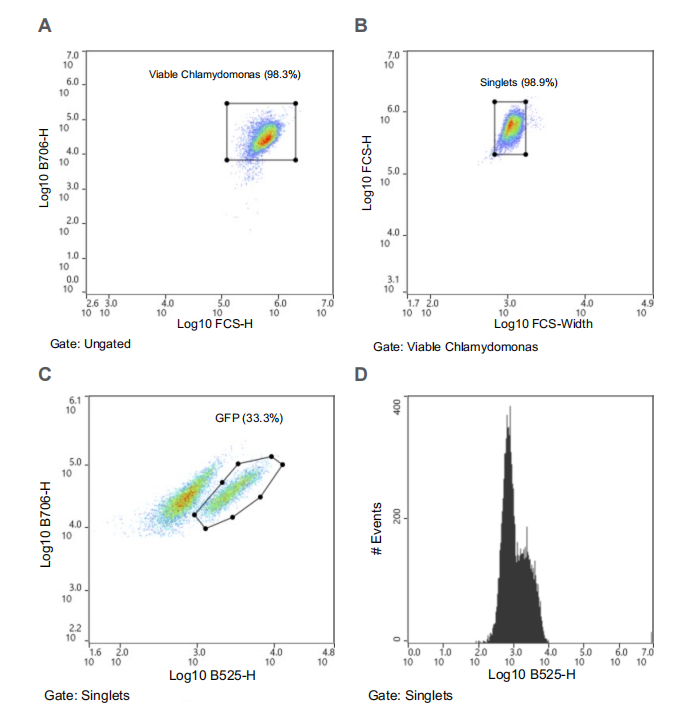 并且使用Novocyte流式細胞儀對GFP陽性萊茵衣藻進行富集后的陽性細胞占比的確認:A圖為富集前的衣藻以9:1的比例混合(WT CC-4533:GFP CC-5416),B圖為富集后的衣藻GFP細胞。