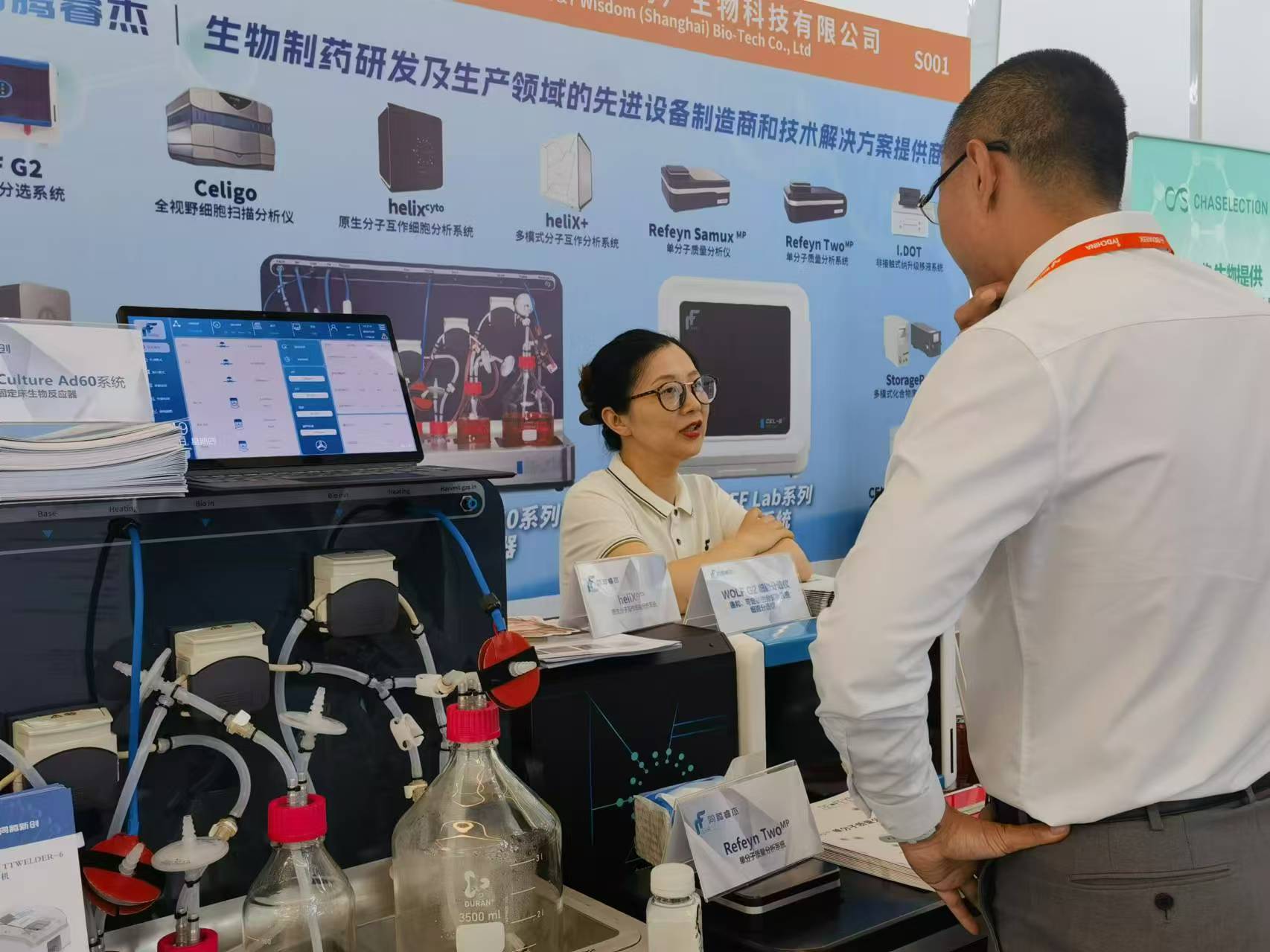 其中,CEL-G®Culture Ad60 系列固定床生物反應器、Refeyn TwoMP 單分子質量分析系統、WOLF G2 單細胞柔性分選系統以及helixcyto 原生分子互作細胞分析系統,憑借其卓越的性能和創新的設計,吸引了眾多專家學者和行業同仁的駐足圍觀與咨詢。