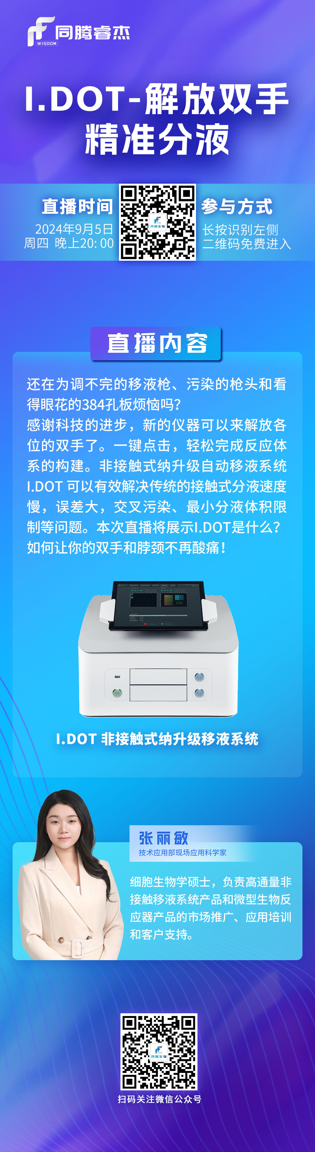 同騰睿杰(上海)生物科技有限公司將于9月5日晚20:00舉行線上直播。我們的特邀講師——同騰睿杰(上海)生物科技有限公司現場應用科學家張麗敏,將為大家帶來以《I.DOT-解放雙手,精準分液》為主題的分享。她將深入淺出地剖析I.DOT如何實現液體處理的極致精準與高效,真正意義上“解放科研人員的雙手”,讓復雜的實驗流程變得簡單可控,大大提升了科研工作的效率與準確性。
