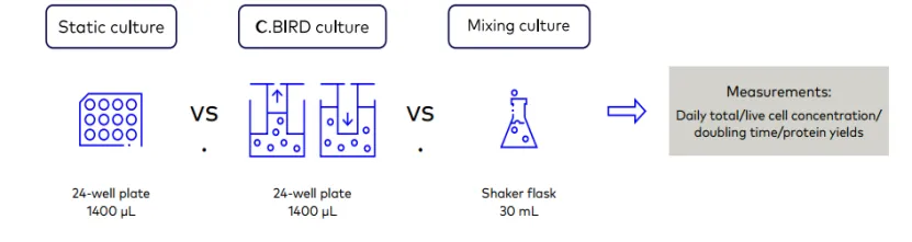 本研究采用CHO-K1和CHO-S單克隆抗體表達細胞系作為模型,比較了傳統(tǒng)靜態(tài)培養(yǎng)、搖瓶培養(yǎng)和C.BIRD?培養(yǎng)方法對細胞生長的影響。細胞在無血清、化學(xué)成分定義的CD Hybridoma培養(yǎng)基中培養(yǎng),使用標(biāo)準(zhǔn)的24孔板進行C.BIRD和靜態(tài)培養(yǎng),每個孔的總體積為1400 μL。搖瓶培養(yǎng)則在130 rpm的軌道搖床中進行,總體積為30 mL。所有細胞和C.BIRD設(shè)備在37°C、5% CO2水套培養(yǎng)箱中連續(xù)培養(yǎng)3天。使用細胞計數(shù)器(Bio-Rad, TC20)計數(shù)細胞數(shù)量和活率。每天的細胞數(shù)在同一板的不同孔中獨立測量,以避免細胞培養(yǎng)過程中額外的擾動。細胞計數(shù)后,每孔補充與細胞計數(shù)相同量的培養(yǎng)基,在隨后的幾天內(nèi)不再測量。蛋白產(chǎn)量通過ELISA試劑盒(Bethyl Lab, E88-104)測量。統(tǒng)計學(xué)采用單因素方差分析。
