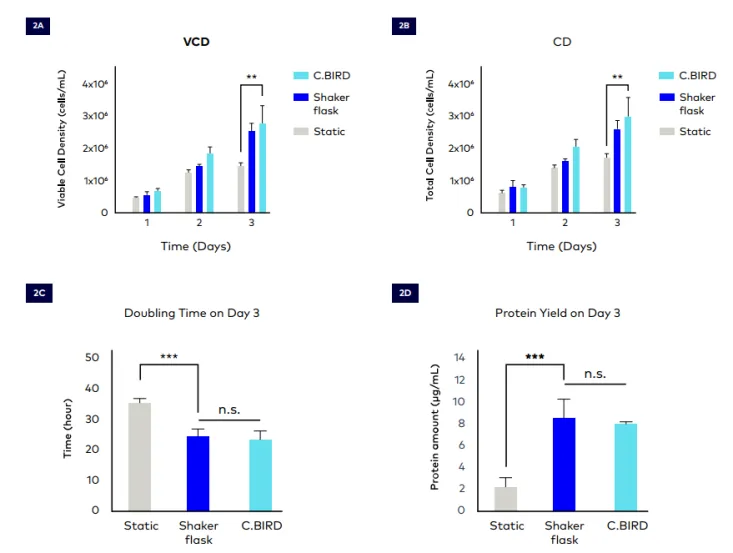 1、 實驗結(jié)果顯示,與傳統(tǒng)靜態(tài)培養(yǎng)相比,C.BIRD?培養(yǎng)的CHO-K1細胞在第3天的活細胞密度和總細胞密度顯著提高。C.BIRD組的平均活細胞密度和總細胞密度分別達到2.87×10^6 cells/mL和3.06×10^6 cells/mL,均顯著高于靜態(tài)培養(yǎng)組(圖2A和2B)。表明C.BIRD?培養(yǎng)方法在24孔板中改善了細胞培養(yǎng)環(huán)境,提供了更高的承載能力。