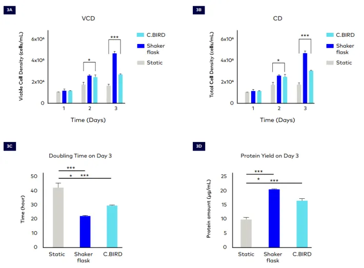 3、與傳統(tǒng)靜態(tài)培養(yǎng)相比,C.BIRD?培養(yǎng)的CHO-S細胞在第3天的活細胞密度和總細胞密度顯著提高。C.BIRD組的平均活細胞密度和總細胞密度分別達到2.67×10^6 cells/mL和3.03×10^6 cells/mL,均顯著高于靜態(tài)培養(yǎng)組(圖3A和3B)。此外,與靜態(tài)組相比,C.BIRD組顯著縮短了CHO-S細胞在第3天的平均倍增時間,從42.43小時縮短至29.77小時(圖3C)。這些結(jié)果表明,C.BIRD方法比靜態(tài)方法更能有效地提高CHO-S細胞在實驗早期的細胞增殖率。