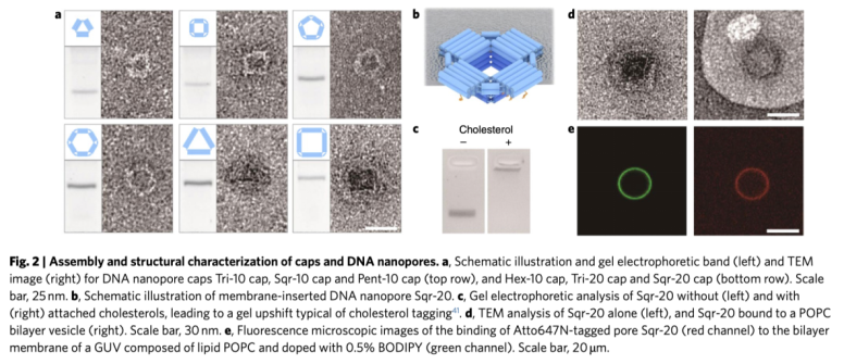 在確定帽設計的可行性后,我們測試了帶有桶狀的穿膜的納米孔通道是否可以在形狀和大小上進行調節。我們測試了三角形-10nm, 方形-10nm和方形-20nm。請見Fig. 2b。對于該結構和膜的相互作用方面,在5x2的雙鏈DNA帽下方攜帶了幾個固醇類生物標簽,每個10nm亞單位連接10個標簽,每個20nm亞單位連接15個標簽。第一步,首先組裝不帶有標簽的孔狀結構,自裝后產生與預期一致的單條帶的DNA以及與預期一致的電鏡結構。第二步,膜孔上連接固醇類標簽。可通過凝膠電泳條帶大小判斷標簽連接的結果。請見Fig. 2c。