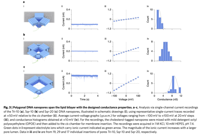 在生物學,便攜式DNA測序,無標記單分子分析和納米醫學方面,膜納米孔都體現了其重要的應用價值。傳統的物質運輸,其依賴于膜上數納米寬的桶狀通道,但是科技發展的需求,需要在形狀上可調控的,更加寬的納米通道,以適應更廣泛的應用。而在天然狀態下,并不存在這種類的納米孔。利用蛋白合成該類型的納米通道,也具有極大的挑戰性。本文介紹了利用DNA進行上述結構可調和功能應用多樣化的膜納米孔的設計。該設計將成束的DNA雙鏈制備成構成膜孔的亞單位,并逐步組裝成形狀上可調節的完整性膜孔,該孔的寬度可達幾十納米。用于識別或信號連接的功能單位,可以與該納米孔進行結合。通過現有儀器設備和檢測手段,本文證明了該定制化的納米孔在電介導的10nm大小的單分子蛋白的檢測上應用潛能,并顯示了在合成生物學,單分子酶學和生物物理分析以及便攜式診斷,環境檢測等方面,該DNA納米結構如何實現對功能性分子的傳遞作用。