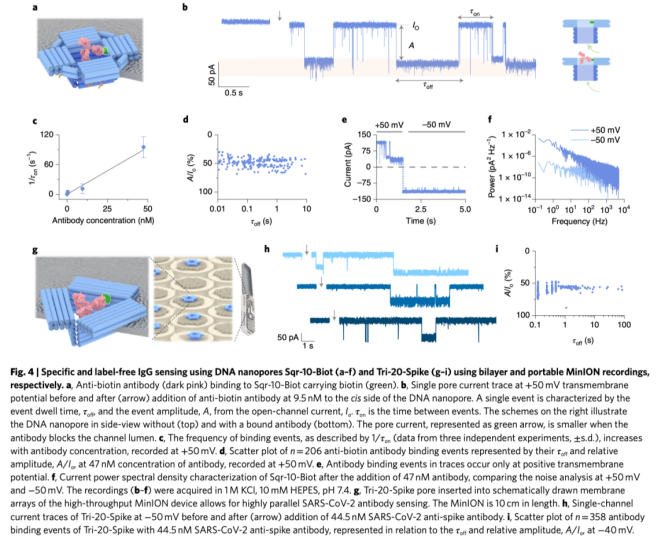 最后,我們評估了DNA納米孔是否可以插入MinION flow 細胞中,并靈敏的感應人SARS-CoV-2抗體。為了更好的與Y型結構的抗體適配,可以選擇三角形-20nm的膜納米孔。請見Fig. 4g。