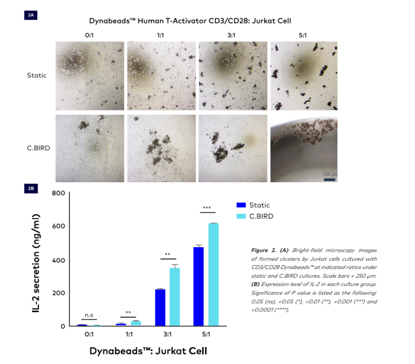 人類 T 細胞激活實驗的設計如圖 1 所示。在激活過程中,人類 T 細胞會形成聚集體并開始增殖。我們觀察了 Dynabeads 人 T 激活劑 CD3/CD28 處理 24 小時后 Jurkat 細胞的形態(圖 2A)。結果顯示,隨著 CD3/CD28 Dynabeads 與 Jurkat 細胞的比例增加,Jurkat 細胞形成了更大的細胞聚集體。在 C.BIRD 培養中,細胞聚集體比靜態培養中的更大。
