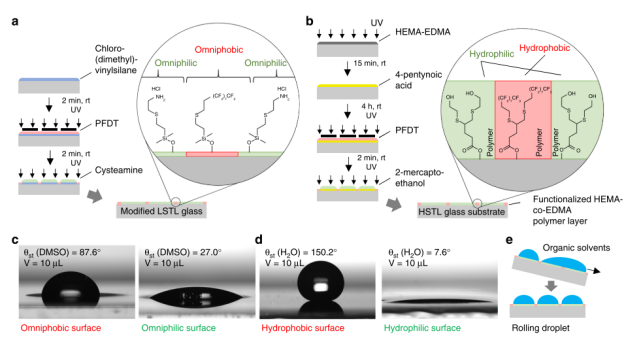 LSTL玻片:通過硅烷化處理和光化學硫醇-烯點擊反應,在玻璃表面形成親疏兩性圖案(圖1a)。親水性區域可穩定低表面張力有機溶劑(如DMSO),疏水性邊界則通過全氟癸硫醇(PFDT)修飾,實現微滴陣列的精準控制。