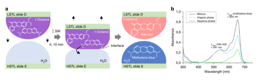 圖3. 片上平行液-液萃取。a芯片上兩相液體萃取過程的示意圖。親油尼羅紅和親水性亞甲基藍在1-辛醇的LSTL載玻片D上的混合物,通過將載玻片與HSTL載玻片E進行10分鐘的水滴分離。兩種不混溶的溶劑之間形成界面,并將水溶性亞甲基藍提取到水相中。B通過紫外-可見光譜法驗證芯片上提取。混合物的UV-Vis光譜顯示兩個局部吸收最大值:一個在541 nm處對應于尼羅紅,另一個在654 nm處對應于亞甲基藍。萃取后,有機相中亞甲基藍的最大吸收強度降低,而尼羅紅的最大吸收強度保持不變。在水相中,沒有檢測到尼羅紅。源數據作為源數據文件提供。