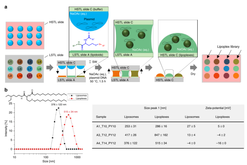 自動化轉移:I.DOT將干燥的脂質體轉移至HSTL玻片(圖4a),與含質粒DNA(pCS2-GFP)的醋酸鈉緩沖液共孵育,形成脂質復合物(lipoplexes)。動態光散射顯示,lipoplexes粒徑(515±34 nm)顯著大于脂質體(376±122 nm),zeta電位更低(-16mVvs+27mV,圖4b)