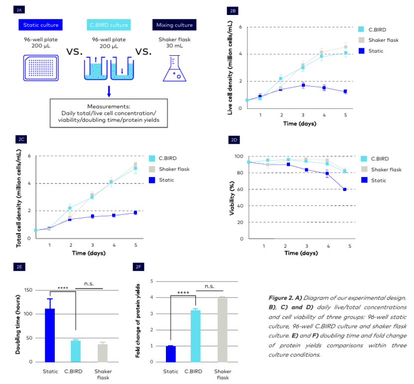 且與靜態培養相比,C.BIRD 培養法顯著縮短了細胞的倍增時間,從 114 小時縮短至 38.5 小時。在搖瓶培養(35.1 小時)和 C.BIRD 培養(38.5 小時)之間,細胞的分裂時間沒有顯著差異。結果表明,96 孔 C.BIRD 具有高性能水平,并且能夠在早期提供搖瓶生長條件(圖 2E)。