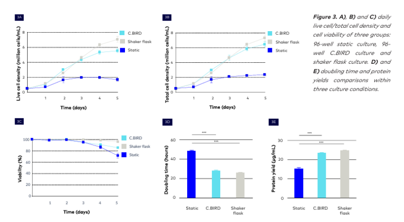 在第 5 天,C.BIRD 懸浮培養達到活細胞密度 5.54×10^6 個/mL,搖瓶培養達到 7.07×10^6 個/mL,而靜態培養僅達到 1.68×10^6 個/mL。(圖 3A)。就總細胞密度而言,96 孔 C.BIRD 培養達到 6.48×10^6 個/mL,搖瓶培養為 1.2×10^6 個/mL,而靜態培養為 1.68×10^6 個/mL。(圖 3B)