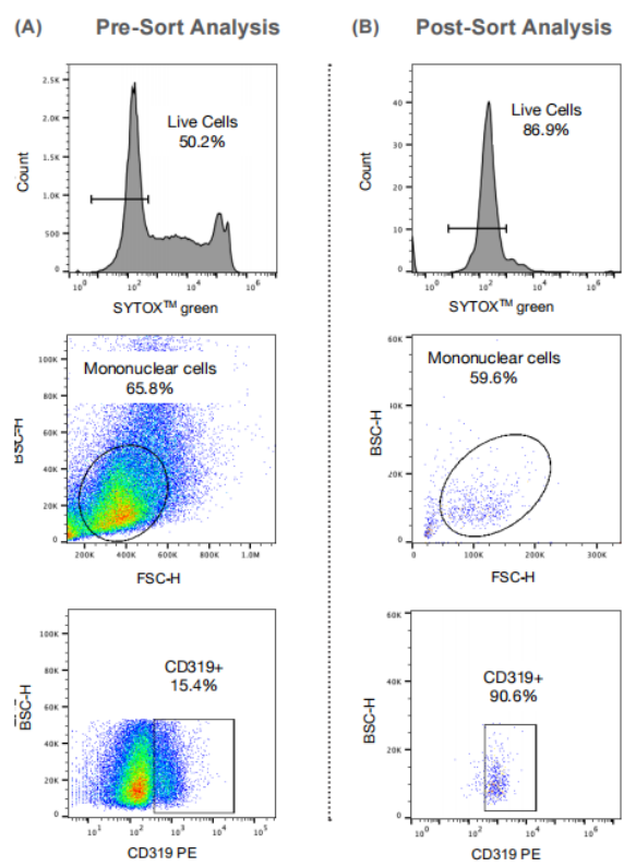 WOLF對樣本的預分選分析表明,樣本中50%的細胞是有活力的,15%的活單核細胞群是MMPCs(CD319+)(下圖左側)。分選后,WOLF能將MMPC細胞群富集到90.6%,并將活細胞群增加到87%(下圖右側)。這些結果表明,WOLF在分選MMPC時足夠精確和溫和,并能在分選后保持細胞活力。
