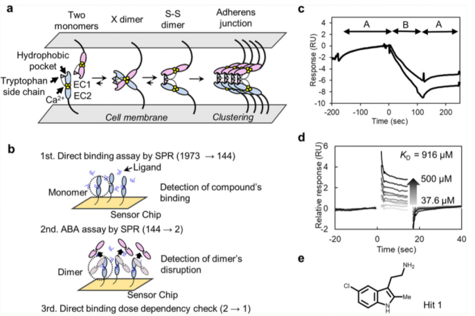 蛋白的組裝揭示了幾乎所有生物學(xué)過程:1. 已有大量被報(bào)道的各種功能復(fù)合物的同源或異源結(jié)構(gòu)信息;2. 能夠?qū)Φ鞍捉M裝進(jìn)行調(diào)節(jié)的調(diào)節(jié)分子可以做為潛在的藥物或探針,用于進(jìn)一步研究蛋白的功能。但小分子在調(diào)節(jié)蛋白-蛋白相互作用及組裝方面存在困難,部分原因如下:首先,蛋白互作通常會(huì)牽涉到較大的分子區(qū)域,但是,小分子可以進(jìn)入的區(qū)域較小。除此之外,在蛋白-蛋白互作界面,通常不存在明顯的凹槽;缺少能夠指導(dǎo)配體分子設(shè)計(jì)的天然蛋白互作分子抑制劑存在。細(xì)胞通過鈣粘素蛋白家族,一類鈣依賴性的細(xì)胞黏附蛋白分子,發(fā)生細(xì)胞之間的黏附,蛋白的組裝。根據(jù)不同的生物組織環(huán)境,鈣粘素分子在各種組織的腫瘤發(fā)生中發(fā)揮作用。P-鈣粘素分子是一種經(jīng)典的鈣粘蛋白,已發(fā)現(xiàn)在許多腫瘤組織中過表達(dá),促進(jìn)了腫瘤的轉(zhuǎn)移和增殖。細(xì)胞之間的聚集體形成,能夠阻止anoikis和P-鈣粘素蛋白介導(dǎo)的信號(hào)通路,這對于腫瘤細(xì)胞的存活至關(guān)重要。因此,P-鈣粘素蛋白功能的抑制已成為一種潛在的抗癌策略。細(xì)胞黏附可以通過不同的細(xì)胞間的鈣粘素蛋白反式同源二聚化實(shí)現(xiàn),也可以通過相同細(xì)胞間的鈣粘素蛋白的順式聚集而成。對于一些類型I的經(jīng)典的鈣粘素蛋白,包括P-鈣粘素,反式同源二聚化已經(jīng)被廣泛的研究。蛋白五個(gè)結(jié)構(gòu)域中的兩個(gè)細(xì)胞外結(jié)構(gòu)域(EC12)經(jīng)證實(shí)在蛋白互作的過程中發(fā)揮作用(請見Fig. 1a)。X二聚物,也被稱為鏈-插入二聚物(S-S dimer),是一種中間過渡狀態(tài),能夠促進(jìn)最終二聚體的形成。S-S二聚物具有一種特定的結(jié)合模式,在該結(jié)合模式之下,一個(gè)單體N末端的色氨酸殘基可以插入另一個(gè)單體的疏水口袋。根據(jù)這種模式設(shè)計(jì)的一些肽類分子模擬配體已有相關(guān)報(bào)道,但還未有相關(guān)的配體分子被鑒定,可能是由于這個(gè)疏水口袋在S-S二聚化狀態(tài)期間,一直被單體自身或另一個(gè)單體的色氨酸殘基所占據(jù),進(jìn)而影響了對相關(guān)分子機(jī)制的更進(jìn)一步深入研究。在體外進(jìn)行S-S二聚化過程的抑制研究也許不是最好的方法,我們需要考慮其他方式,研究小分子在調(diào)節(jié)細(xì)胞黏附分子組裝方面的功能。