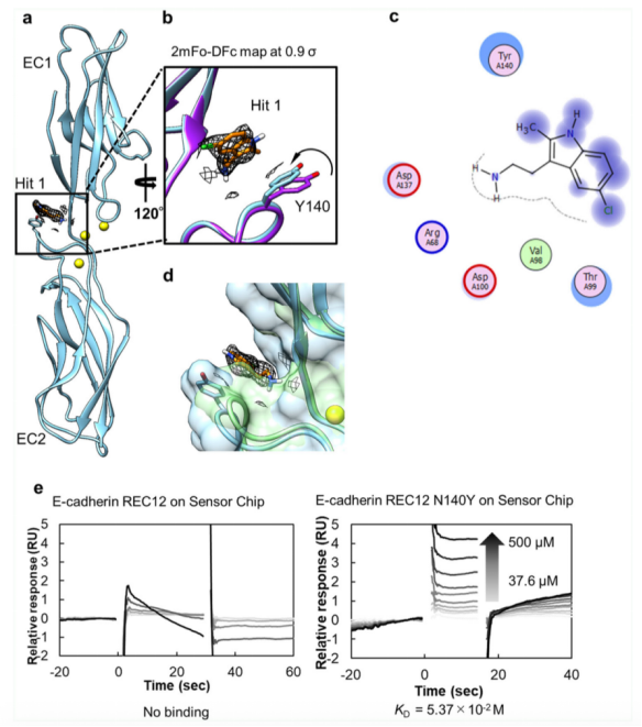 本研究中,我們對這個(gè)過程下的任何狀態(tài)進(jìn)行了小分子篩選,該篩選文庫包括類似藥物的小分片段,鑒定出了一種全新的可以特異性與P-鈣粘素蛋白結(jié)合的小分子。該化合物分子能夠通過調(diào)節(jié)X二聚化抑制細(xì)胞之間的黏附,間接的抑制了能夠穩(wěn)定X二聚物的疏水鍵的形成。