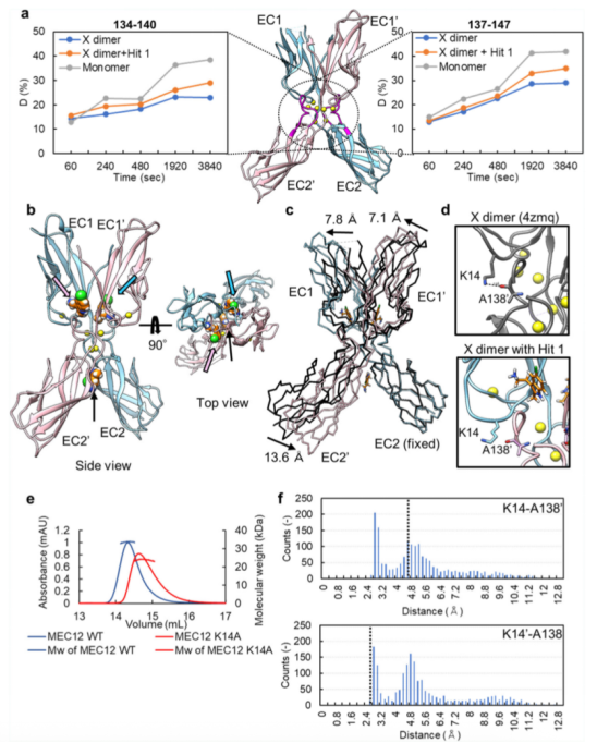 為了檢測Hit 1對X二聚化的影響,本文利用了氫-氘交換質(zhì)譜分析法(HDX-MS)。該方法能夠檢測在Hit 1存在與否的情況下,X二聚物的互作面有多大程度暴露在溶劑中。在采用 LC-MS 進(jìn)行檢測之前先進(jìn)行胃蛋白酶處理,從而能夠從 P-鈣黏蛋白分子的幾乎所有區(qū)域分離出肽片段。在Hit 1存在與否的情況下,檢測每一段肽段的HDX比率(氫氘交換比率)。在相互作用界面之一(殘基134-140和137-147)的相應(yīng)區(qū)域,該區(qū)域由于在EC12的N端插入了甲硫氨酸,能夠形成X二聚物,但不能形成S-S二聚物,因此抑制了strand-swapping,Hit 1存在時(shí)的氫氘交換比率高于未結(jié)合Hit 1時(shí)(請見Fig. 3a)。該結(jié)果表明,Hit 1對X二聚物的互作界面能夠產(chǎn)生影響。