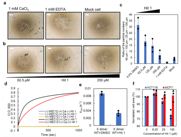 當(dāng)同時(shí)添加Hit 1和1mM的CaCl 2分子時(shí),聚集體的形成呈現(xiàn)Hit 1濃度依賴的方式(請見Fig. 4b, c)。而當(dāng)Hit 1加入到已經(jīng)形成聚集體的培養(yǎng)體系中時(shí),在檢測時(shí)間段,形成的聚集體仍舊穩(wěn)定存在,而EDTA能夠部分的破壞已經(jīng)形成的聚集體。這些結(jié)果說明,Hit 1是通過阻止X二聚化形成過程中兩個(gè)單體分子的互作,一旦細(xì)胞聚集體形成,Hit 1是無法破壞它們的互作穩(wěn)定性的。
