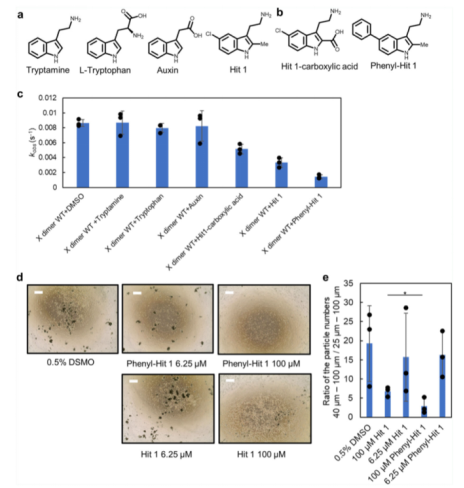 由于Hit 1以及初篩鑒定的許多化合物都包括陽離子功能基團(tuán),我們因此通過基于吲哚的商業(yè)化合物:tryptamine, tryptophan, 和 auxin 鑒定了陽離子功能基團(tuán)對于結(jié)合活性的重要性(請見Fig. 5a)。令人驚訝的是,只有tryptophan與 P-鈣黏蛋白結(jié)合,這可能是由于Hit 1結(jié)合口袋周圍蛋白表面存在著負(fù)電荷。該結(jié)果表明,在進(jìn)一步的藥物發(fā)現(xiàn)中,不應(yīng)對陽離子基團(tuán)進(jìn)行修飾改造。根據(jù)Hit 1和P-鈣粘素蛋白的2D相互作用圖譜的研究(請見Fig. 2c),我們制定了兩個(gè)進(jìn)一步合成的策略:(1)將吲哚環(huán)第二個(gè)位置的甲基替換成羧基,這將導(dǎo)致羧基和R68,氨基和D137之間形成鹽橋;(2)將吲哚環(huán)中 C5 位置的氯原子替換為一種更大分子量的官能團(tuán),抑制第二個(gè)單體的接近。我們首先合成了3-(2-氨基乙基)-5-苯基-1H-吲哚-2-羧酸(簡稱 Hit 1-羧酸,請見Fig. 5b),但是從SPR親和性檢測來看,它與REC12的親和性并不優(yōu)于Hit 1,也不具備細(xì)胞聚集抑制效應(yīng)。接下來,我們合成了 2-(2-甲基-5-苯基-1H-吲哚-3-基)乙烷-1-胺(苯基-Hit 1)(請見Fig. 5b)。通過SPR互作檢測分析,我們觀測到一種劑量依賴性應(yīng)答;其與REC結(jié)合的親和性與Hit 1相同。在脂質(zhì)體聚集檢測中,苯基-Hit 1相比較于Hit 1,具有更強(qiáng)的抑制活性。tryptamine, auxin 和 tryptophan對聚集效應(yīng)影響較小(請見Fig. 5c)。Tryptamine 不具有大的功能基團(tuán),這可能是它不能抑制脂質(zhì)體聚集的原因。在細(xì)胞聚集檢測中,苯基-Hit 1相較于Hit 1具有更強(qiáng)的抑制效應(yīng),且苯基-Hit 1與X二聚體的結(jié)合親和性要強(qiáng)于單體P-鈣粘素蛋白。