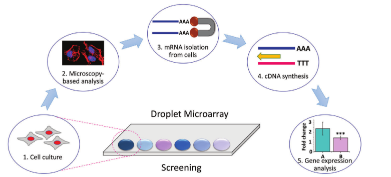 圖1. “芯片上細(xì)胞至cDNA”方法的示意圖。1=在DMA上以微/納升液滴進(jìn)行細(xì)胞培養(yǎng)和篩選,2=通過(guò)基于顯微鏡的方法進(jìn)行細(xì)胞表型分析,3=使用聚T磁珠進(jìn)行細(xì)胞裂解和mRNA分離,4=在同一液滴內(nèi)將mRNA轉(zhuǎn)化為cDNA,5=收集cDNA用于定性和定量基因表達(dá)分析。