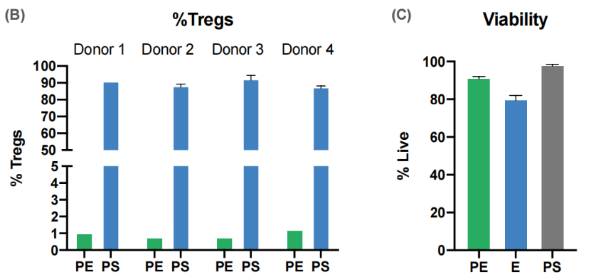 由下方左圖結果可以看出,淋巴細胞群內的Tregs平均從1%富集至85-94%。并且在分選中通過結合散射和熒光活力染料鑒定活細胞來消除死細胞,富集前,平均91%的細胞群是活細胞,富集CD4+T細胞群后,活細胞百分比略有下降(80%),然而,在使用WOLF微流控柔性分選儀將死細胞和碎片排除后后,幾乎所有(98%)分選的細胞都是活的(下圖右)