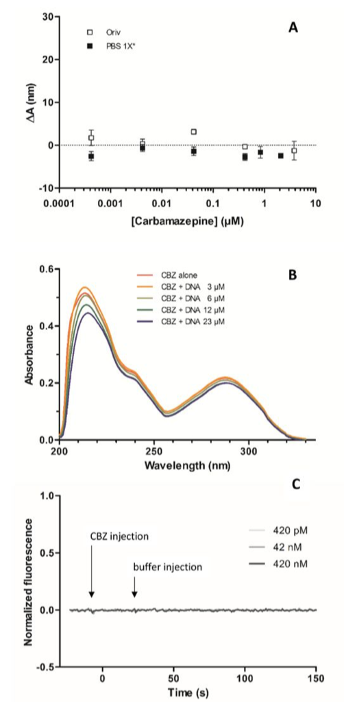 卡馬西平是廣泛使用的抗驚厥藥物,屬于最常出現在地表水中的殘留化合物分之一,其出現頻率之高甚至被認為可以作為水生環境的人為污染標志物。盡管其已經證實具有慢性的基因毒性,但是其與DNA相互作用機制報道仍舊較少。如Fig 4A顯示,在合成水和 1X PBS中,隨著卡馬西平濃度從 0uM升至4uM,跨越40個濃度梯度,均未觀察到A值的變化??紤]到卡馬西平在水中較低的溶解度,我們利用HPLC測量了藥物的濃度。我們首先重復了已報道的所進行的吸光度測量,通過記錄在 1X PBS 緩沖液中加入逐漸提高濃度的含有ctDNA 的卡馬西平溶液的紫外-可見吸光度譜,并將緩沖液的吸光度譜作為參考(請見Fig 4B)。結果顯示,吸收光譜并未出現任何變化,尤其沒有出現因離子嵌入而產生的藍色位移特征。其次,我們采用了最新的 Switchsense 技術進行重復檢測,同樣并未觀測到卡馬西平與DNA相互作用的發生(請見Fig 4C).