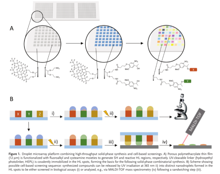 圖1. 液滴微陣列平臺(tái)結(jié)合高通量固相合成和基于細(xì)胞的篩選。A)多孔聚甲基丙烯酸酯薄膜(12 μm)用氟烷基和半胱胺部分官能化以分別產(chǎn)生SH和反應(yīng)性HL區(qū)域。UV-可切割的連接體(羥乙基光連接體,HEPL)共價(jià)固定在HL斑點(diǎn)中,形成后續(xù)固相組合合成的基礎(chǔ)。B)顯示可能的基于細(xì)胞的篩選順序的方案:合成的化合物可以通過(guò)在365 nm下的UV照射ii)釋放到在HL斑點(diǎn)中形成的不同納米液滴中,以在生物測(cè)定(i)中篩選或分析,例如,通過(guò)MALDI-TOF質(zhì)譜法(iv),隨后進(jìn)行純化步驟