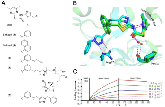 Sirt2的功能失調(diào)和多種疾病的發(fā)生相關(guān),包括細(xì)菌感染,類型II糖尿病,神經(jīng)退行性疾病和腫瘤,提示Sirt2有希望成為一個(gè)藥物干預(yù)的靶點(diǎn)。然而,對于一些疾病,包括亨廷頓氏病以及一些類型的腫瘤,還未最終被明確Sirt2是被上調(diào),還是被下調(diào)或者被抑制,進(jìn)而改善特定的疾病狀態(tài)。由于迫切需要合適的工具化合物來進(jìn)一步研究 Sirt2 去乙酰化對細(xì)胞的影響,并驗(yàn)證 Sirt2 作為藥物靶點(diǎn)的潛力,因此人們發(fā)現(xiàn)了多種具有藥物特性的 Sirt2 選擇性小分子抑制劑。最近,我們已經(jīng)發(fā)現(xiàn)了一類新的Sirt2高度選擇性抑制劑(請見Figure 1A).這些化合物在較低的uM到nM濃度范圍內(nèi)抑制Sirt2, 然而對于它的相近的同源物Sirt1和Sirt3卻沒有檢測到抑制效應(yīng)(IC50>100uM)。