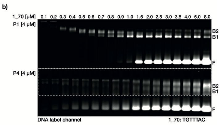 當將兩個具有不同序列的DNA靶分子混入相同的蛋白樣本中時,蛋白將根據(jù)相對親和性區(qū)分靶分子。確實,與TATTTGC或TCTTGAC相比,我們發(fā)現(xiàn)蛋白突變體P1更傾向于與TGTTTAC序列結(jié)合。當?shù)鞍淄蛔凅wP1與相同的TGTTTAC序列,但分別為32或70個堿基對的序列混合時,蛋白并未表現(xiàn)出結(jié)合偏向。