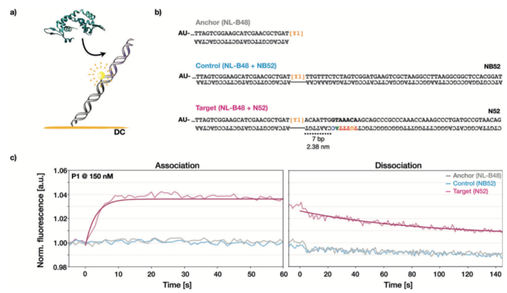在FPS測量中,我們監(jiān)測到含有FOXP2結(jié)合保守序列的DNA靶分子的熒光強度發(fā)生變化,然而包含錨定雙螺旋或更長的陰性對照組未檢測到明顯的熒光強度的改變(請見Figure 2c)。