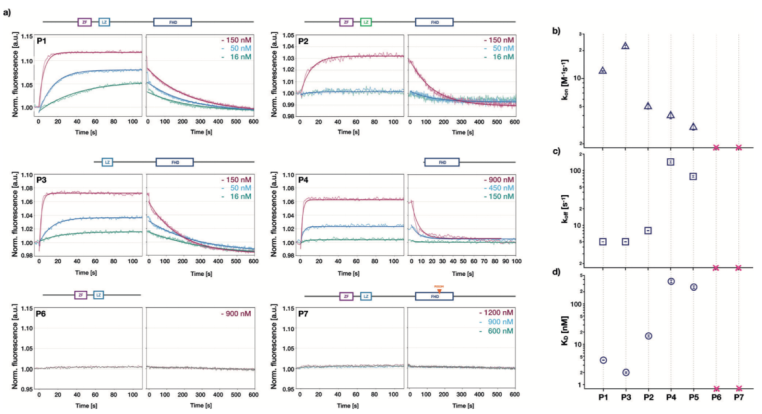 為了檢測鋅指基序,亮氨酸拉鏈和叉頭狀結(jié)構(gòu)域?qū)OXP2與DNA的結(jié)合的影響,我們在生物芯片上利用不同的突變體進行濃度依賴性的結(jié)合親和性檢測。對于突變體P1-P5,都包含叉頭狀結(jié)構(gòu)域以及突變體P6和P7,可參考Figure 1a中的蛋白結(jié)構(gòu)示意圖。一旦蛋白加入流動系統(tǒng),熒光強度增加,當?shù)鞍妆幌疵摃r,熒光強度降低(請見Figure 3a)。在這兩個階段中,信號最終都達到穩(wěn)態(tài)。隨著蛋白濃度的不同,穩(wěn)態(tài)期的熒光強度存在差異。更高的蛋白濃度產(chǎn)生更高的絕對熒光強度(請見Figure 3a)。因此,蛋白濃度的增加導致表面附著的DNA中被蛋白占據(jù)的比例增加,與可逆結(jié)合反應的預期一致。當?shù)鞍妆幌疵摃r,穩(wěn)態(tài)期的熒光強度會恢復到蛋白結(jié)合之前的狀態(tài),表明所有結(jié)合的蛋白都被解離。