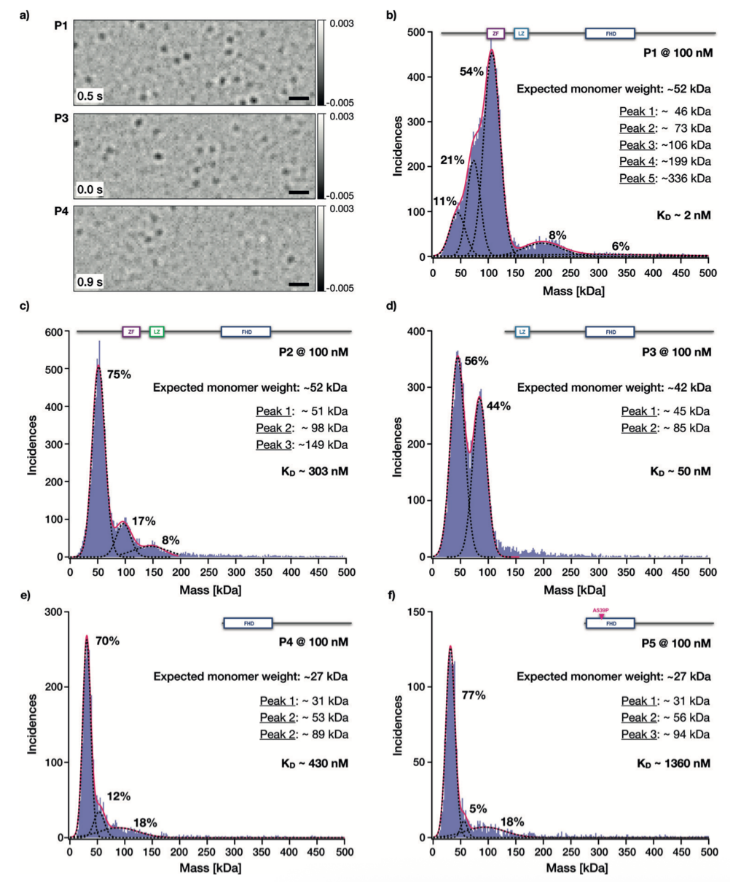 對于蛋白突變體P2,由于在亮氨酸拉鏈域含有三個亮氨酸替換丙氨酸的突變,我們獲得了完全不同的分子質(zhì)量分布結(jié)果。75%的顆粒的平均分子量為51 kDa,非常接近52 kDa的P2單體分子量。我們因此推測該顆粒為單體形式。分子量更高的顆粒質(zhì)量分別為100 kDa和150 kDa,因為該數(shù)值是50 kDa的整數(shù)倍,我們推測該顆粒分別為P2的二聚體和三體。