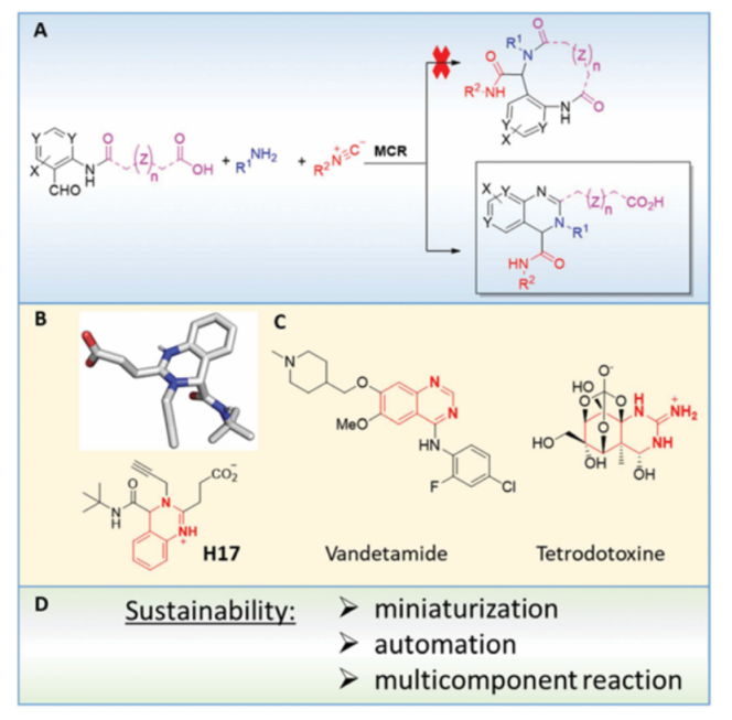 多組分反應化學基于原子經濟性、步驟預防、收斂性等原則,長期以來一直被認為接近“完美”的綠色化學,并且最近在這方面也進行了相關綜述。它已經反復證明,通過在目標合成中引入多組分反應(MCR),可以顯著減少總的步驟數量,同時提高產率。最典型的例子是奧魯等人通過合成這種復雜的肽模擬物化合物所實現的特雷普維拉丙肝抑制劑的合成過程。在這種復雜肽模擬物化合物的合成中引入兩個 MCR 步驟,使長達 20 步的工業合成縮短了約 50%。在此,我們以示例的形式展示了一種基于若干主要可持續性原則的新反應的發現、范圍和局限性研究,該反應可生成基于喹唑啉骨架的小分子。