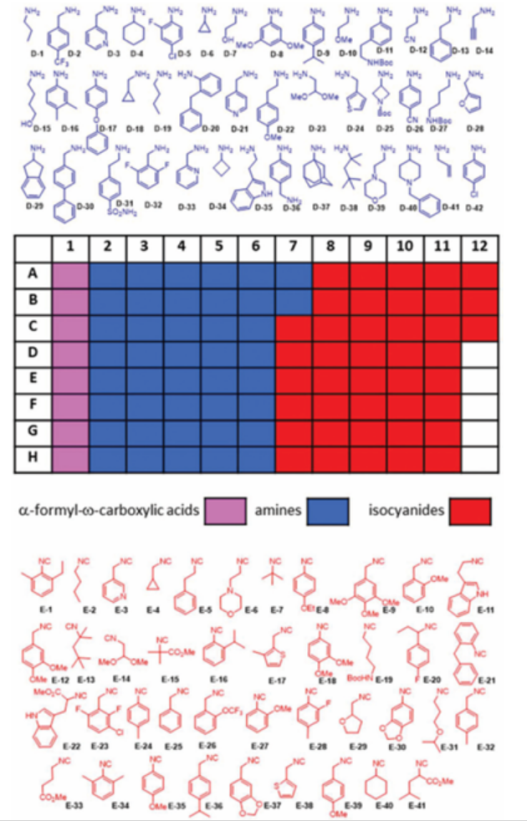 將三種起始材料類別的構建單元填充到 384 孔板中所需的時間不到 20 分鐘。反應在室溫下進行 24 小時,通過密封板并將其放置在搖床上完成。然后將培養皿拆封,并粗制混合物注入質譜儀中,對培養基進行分析。