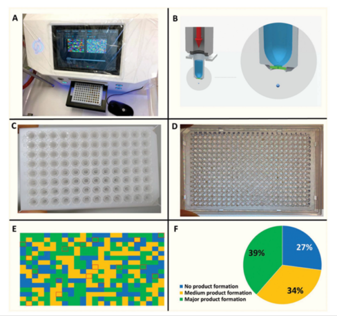 圖3 納升級合成一系列喹唑啉化合物。(A)I-DOT 納升級分液系統。(B)“即時按需滴注技術”(I-DOT)采用非接觸式、基于壓力的分配技術。在底部帶有小孔的 96 孔微升板頂部施加一個明確的壓力脈沖,即在每個孔中形成一個高度精確的納升液滴,并將其釋放到任何目標板中。(C)I.DOT的 96 孔源板。(D)一個 384 孔聚丙烯目標板。(E)基于質譜分析的代表 384 孔板的熱圖。(F) 384 孔板整體合成成功的餅狀圖。