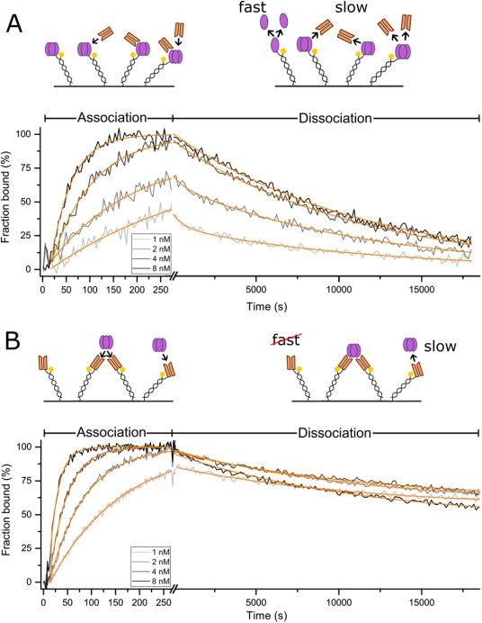 首先,我們研究了單價阿達木單抗Fab在兩個方向上與三聚體TNF-a結合的更簡單情況。在相反的試驗方向中,阿達木單抗Fab與固定化三聚體TNF-a的結合動力學(圖2A)可以通過單指數函數描述。與固定配體的每個結合事件都是獨立檢測的,這對應于1:1的相互作用。Fabs從部分飽和表面(注射1和2 nM Fab)的分解動力學是雙相的,具有快速和緩慢的速度,分別為kFast=1.42±0.39 10- 3s-1和kSLOW =8.52±0.28 10- 5s-1(圖2A和S3)??焖俚姆蛛x率類似于之前確定的TNF-a單聚化率,并且很可能源于未被結合的Fab穩定的TNF-a三聚體的衰變。緩慢的速度可以歸因于Fab與固定化的TNF-a三聚體的分離,這可以通過與圖*中相反的檢測方向進行比較來看出。在這里,發現了與固定化阿達木單抗Fab的分離率相同的速率。正如預期的那樣,沒有觀察到快速單體化。相反,可觀察到的動力學表明第三個甚至更慢的分解過程,這是可感知的,因為信號在18,000秒的運行時間內沒有接近基線。這可以用親合效應來解釋,即兩個或三個固定的阿達木單抗Fab通過一個緊密結合的三聚體TNF-a相互連接。已知固定阿達木單抗Fab的多價結合形成高度穩定的復合物。