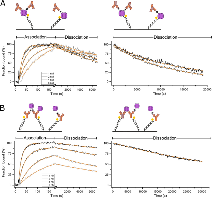 圖3. TNF-a-阿達木單抗相互作用。以反向(固定化的TNF-a,A)和正向試驗方向(固定化的阿達木單抗IgG,B)記錄了TNF-a與阿達木單抗的相互作用。記錄的關聯時間為160秒,分離時間為7200秒。此外,對于最高分析物濃度,記錄了18,000 s(A)和30,000 s(B)的更長的分解階段。分析物溶液以1、2、4、8 ns(淺灰色至黑線)的濃度進樣。橙色線代表適合數據。