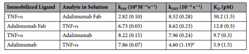 表1列出了確定的TNF-a和阿達木單抗Fab/完整阿達木單抗抗體之間相互作用的動力學速率和親和力。溶液中固定化阿達木單抗IgG和TNF-a的解離速率常數與已發表的數據完全一致。作為一個重要的結果,我們觀察到兩種檢測方向的一致親和力和相似的速率,首次表明方向不會顯著影響結合模式及其親和力。