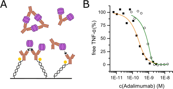 作為之前描述的結合動力學測量的補充方法,我們通過溶液滴度進行了親和力測量,這排除了由于固定化過程而可能出現的偽影。將TNF-a和抗體以不同比例混合在溶液中并允許結合。平衡后,生物傳感器以濃度測量模式測量未結合的TNF-a的剩余分數。在這里,我們使用固定化阿達木單抗來檢測在具有恒定濃度的TNF-a和增加濃度的阿達木單抗預孵育的溶液中剩余的具有結合能力的TNF-a(-復合物)(圖4A)。進行此類實驗的困難在于兩種結合劑的多價性(TNF-a三聚體= 3,阿達木單抗= 2),這導致形成更高級的復合物,正如之前所描述的那樣(形成由三個阿達木單抗IgGs互連的三個TNF-a三聚體)。由多個TNF-a和多個阿達木單抗分子組成的幾種不同復合物可以被表面束縛的阿達木單抗結合,這就是為什么圖4A中采用的簡單1:1匹配模型低估了劑量反應的陡峭性,只能被認為是一種近似。此外,TNF-a的濃度應該在生物學相關范圍內(必須存在三聚體),但要低到足以仍然到達KD敏感區域。對于這里的實驗,選擇c(TNF-a)為100 pM和500 pM。溶液親和力測量證實了動力學實驗中確定的解離常數,KD(c(TNF-a)= 100 pM)= 53.6±29.5 pM; KD(c(TNF-a)= 500 pM)< 30.0 pM)(圖4 B)。