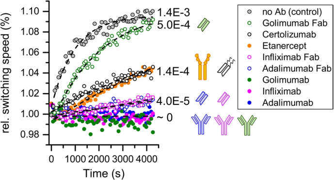 在表征多價性對TNF-α-阿達木單抗/阿達木單抗Fab相互作用中相互作用參數的影響后,我們研究了TNF-α與5種不同抗TNF-α抗體及其Fab片段復合物的單體化。為此,將TNF-α固定在傳感器表面上,并用5 nM相應的TNF-α清除劑飽和。然后,將表面連續暴露于TNF-α清除劑(5 nM)以確保清除劑不能有效地從表面解離。這樣,轉換速度信號的增加表明清除劑結合的TNF-α的衰減,但不是清除劑解離。開關速度監測70分鐘。觀察到所有的TNF-a狂熱結合物(阿達木單抗、英夫利西單抗、戈利木單抗)的單體化完全抑制(轉換速度沒有增加),這些結合物可以形成相互關聯的多重結合復合物(圖5,純藍色、品紅色和綠色符號)。阿達木單抗和英夫利西單抗的這些發現與文獻一致。然而,在FRET試驗中,與戈利木單抗復合物中,TNF-a單體化速度更快被發現。我們僅在源自戈利木單抗的Fab片段中觀察到這種行為,其對單體化的抑制最弱(圖5,開放綠色符號)。與自由單體化率(圖5,灰色符號)相比,與戈利木單抗Fab復合的率僅降低了三倍。相比之下,來自阿達木單抗和英夫利西單抗的Fab片段對單體化表現出更強的抑制作用(圖5,空心藍色和品紅色符號)。受控消化抑制了相互連接,但英夫利西單抗Fab和阿達木單抗Fab的單聚率仍然剛剛提高到可檢測水平(kMONO=4.0E-5 s-1)(圖5,空心藍色和品紅色符號)。Van Schie還描述了在Certolumab存在下的中等快速單體化。Scallon等人發現,在Etanercept的存在下,放射性標記的TNF-a可以快速替代。在這里,兩種不代表完整抗體的治療形式,即塞爾托珠單抗和依那西普,都顯示出中等快速的單體化(圖5,分別是空心黑色和實心橙色符號)。