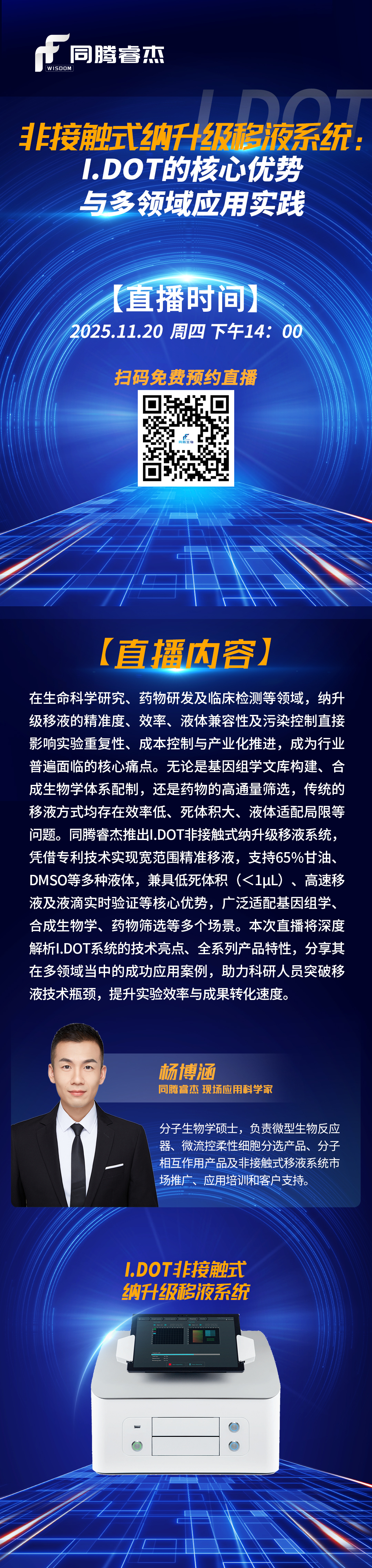 分享會定于 11月20日(星期四)14:00 準時開播,公司現場應用科學家楊博涵將擔任主講嘉賓,帶來《非接觸式納升級移液系統:I.DOT 的核心優勢與多領域應用實踐》的深度分享。期待與您云端相聚,共探技術創新之路!