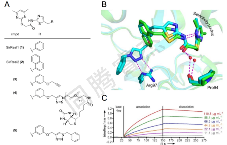 這導致配體在其靶上的長停留時間(即配體-蛋白質復合物的壽命),并導致緩慢的解離(圖1C)。發現配體結合時靶蛋白的構象適應可以極大地影響停留時間,這與報道的文獻一致。此外,增加停留時間被認為是優化細胞活性的藥物設計的關鍵策略。然而,如Sirt2與基于三唑的SirReal (5)的復合物的共晶體結構所示,在標記過程中作為接頭部分引入的三唑部分也通過特異性相互作用參與Sirt2結合。三唑與輔因子結合環的Arg97形成氫鍵(圖1B)。為了探究Sirt2親和探針(4)的長停留時間是引入三唑部分的結果還是主要歸因于SirReal核心,我們正在尋找一種能夠在無標記方法中確定結合動力學的技術。
