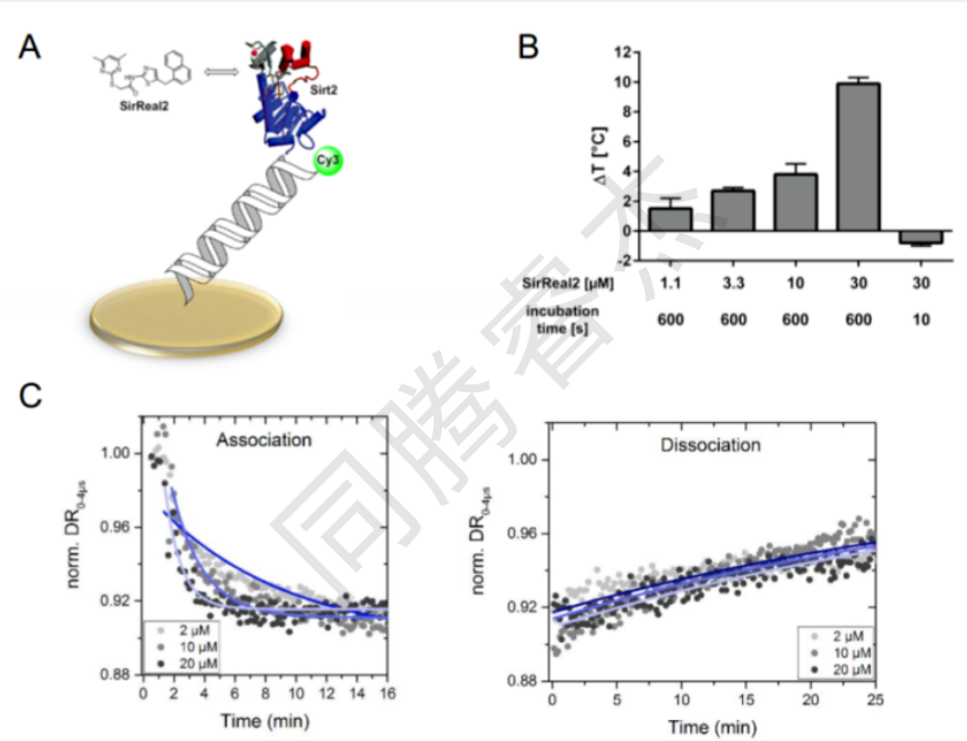 我們發現sirtuin重排配體(SirReals)是RAD+依賴性的Lyrtuin脫乙化酶Sirt 2的高效和選擇性抑制劑。使用生物素化的SirReal結合生物層干涉測量法,我們之前觀察到載體-酶復合物的緩慢分解速度,這被認為是SirReals高親和力和選擇性的關鍵。然而,為了將生物素連接到SirReal核心,我們引入了三唑作為連接部分,X射線共晶體學表明其與輔因子結合環的Arg 97相互作用。在此,我們的目標是闡明觀察到的SirReals的長停留時間是主要由三唑摻入引起的,還是SirReal抑制劑核心的固有特征。因此,我們使用基于電可切換DNA納米層的新型無標簽switchSENSE®技術來驗證SirReals的長停留時間確實是由核心支架引起的。