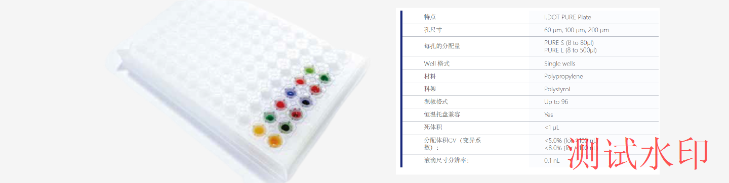 I.DOT Pure Plates 由SBS兼容的聚酪醇框架和96個單獨的聚丙烯孔組成。每個孔都有一個精確的100微米孔洞,以確保液滴的最大再現性。