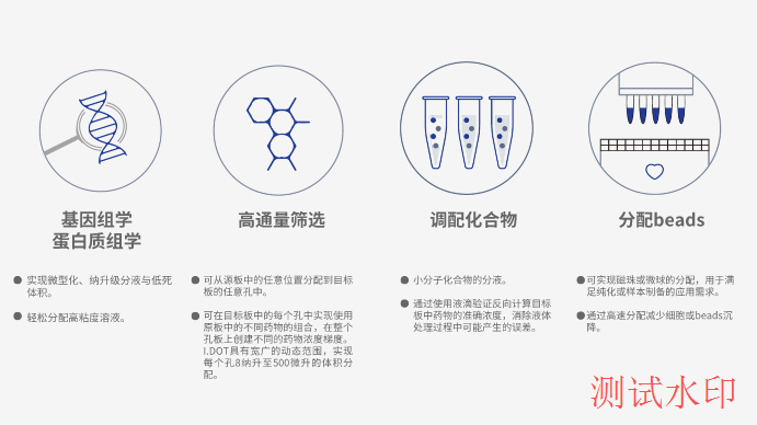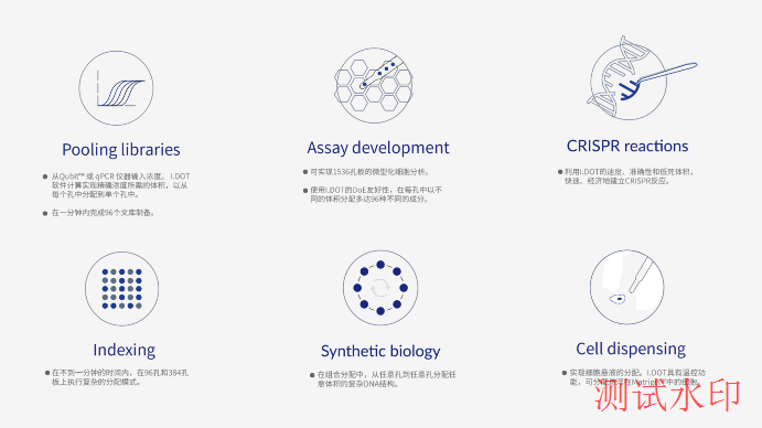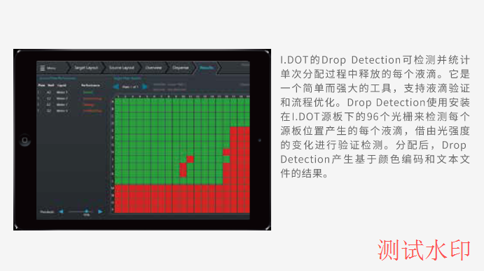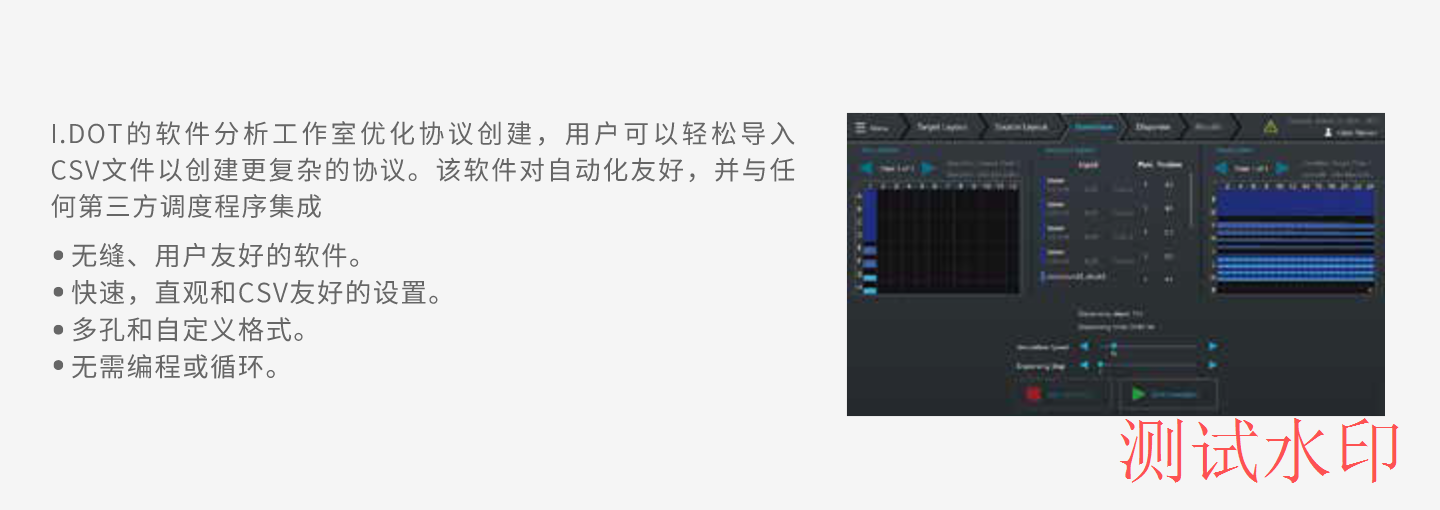 即時點滴技術 (I.DOT) 用于優化非接觸液體處理任務。該系統使用八個單獨控制的正壓通道,從每個孔底的小孔中產生8到50納升的液滴。每個通道每秒最多可生成100個液滴。
