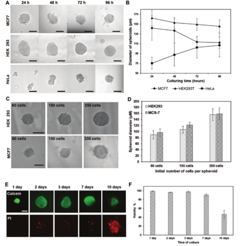 圖3. 在微滴微陣列(DMA)平臺上制造和培養球狀體。a)在細胞接種后24、48、72和96小時,由MCF-7、HEK 293和HeLa細胞形成的球狀體的雙視野顯微鏡圖像。比例尺:100 μm。b)從在80 nL液滴中培養96小時的MCF-7、HEK 293和HeLa細胞系獲得的球狀體的直徑。初始細胞數平均為150個細胞/球狀體。c)由HEK 293和MCF-7細胞系形成的球狀體的雙視野顯微鏡圖像,從約60、150和350個細胞/球狀體開始。比例尺:100 μm。d)從不同初始細胞數開始的HEK 293和MCF-7細胞系獲得的球狀體的直徑。e)在DMA上培養1、2、3、7和10天而不更換培養基的HEK 293球狀體的顯微鏡圖像。用鈣黃綠素AM和碘化丙啶(PI)染色球體。比例尺:100 μm。f)由在DMA上培養10天而不更換培養基的HEK 293細胞形成的球狀體的活力。* 所有圖表上的誤差線表示標準偏差。