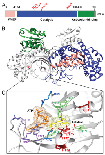 組氨酰-tRNA合成酶,是與CMT疾病相關的6種aaRSs中的一種,被歸類為 CMT2W 亞型,其主要表現為軸索型癥狀,并且為常染色體顯性遺傳。根據新的CMT疾病分類標準,該亞型也被稱為AD-CMTaxHARS。人類的HisRS蛋白由三個不同的結構域組成:N-端的WHEP結構域,催化結構域和C端反密碼子結合域(請見Fig. 1A)。有趣的是,與CMT疾病相關的HisRS突變位于催化位點附近的催化結構域(請見Fig. 1)。