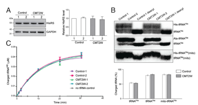 酵母互補實驗中,HisRS P134H完全無法支持細胞的生長,表明突變蛋白缺乏將tRNA與組氨酸結合的酶活性。為了在P134H的病人樣本中更進一步理解是否野生型HARS等位基因能夠提供足夠的酶活性以代償等位基因突變造成的功能喪失,我們分析了CMT2W病人家族中的HisRS酶活性。首先比較了來自于2例P134H病人和2例沒有攜帶突變的正常家族的永生的淋巴細胞中的HisRS蛋白水平,未發現差異(請見Fig. 2A),表明突變未影響HisRS的表達和穩定性。為了評估HisRS的酶活性,我們通過Northern blot檢測在這些樣本中,內源性tRNAs的原位氨酰化狀態。提取樣本總RNAs并于酸性條件下進行凝膠電泳,以維持tRNAs的酰化狀態。細胞中,同源胞質型 tRNA 的帶電部分(結合組氨酸)占比約為 50%,該水平在病人和健康的家族樣本中是一致的(Fig. 2B)。做為對照,我們鑒定了非同源的細胞質tRNA(tRNAAIa)和線粒體tRNA的His水平,同樣未發現差異(請見Fig. 2B)。接下來,為了確認病人樣本中酶活性喪失的情況,我們使用細胞裂解液進行了體外氨酰化檢測,比較了蛋白將tRNA氨酰化的能力。我們發現在2例CMT樣本和對照樣本中,氨酰化酶活性并未降低(請見Fig. 2C)。明顯的是,與野生型HisRS相比,P134H突變的HisRS未產生(顯性)負效應,以減弱細胞中tRNA的氨酰化的能力。因此,我們推斷在大多數嚴重的病人細胞中,tRNA攜帶His的水平未受到影響。