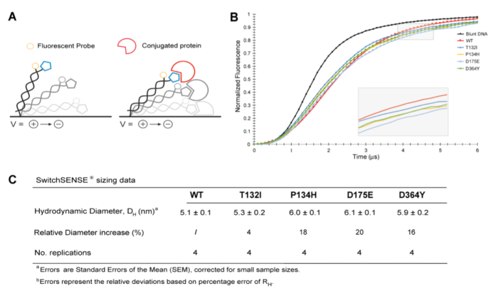 為了證實觀測到的所有4種CMT突變能夠誘導蛋白形成疏松結構,我們利用switchSENCE技術評估這些蛋白的流體動力學半徑。短的雙鏈DNA一端被偶聯在芯片的金屬表面,另一端與待測蛋白進行結合(請見Fig. 4)。交替變換的正負電壓作用于該DNA雙鏈,并通過與DNA雙鏈連接的熒光探針實時記錄蛋白的運動軌跡。一旦HisRS蛋白偶聯到DNA雙鏈,DNA雙鏈的流體動力學摩擦系數受到影響,DNA的運動速率也同樣受到影響。儀器記錄DNA雙鏈的運動情況,通過該運動的變化情況估測蛋白的流體動力學半徑。我們發現所有的突變體,與野生型相比,流體動力學半徑都有不同程度的增加,相對增加程度在4%和20%之間。HisRS T132I的增加是最小的,與野生型相比,僅有4%的增加。HisRSP134H , HisRSD175E 和HisRSD364Y的變化較為相似,分別為18%,20%和16%。